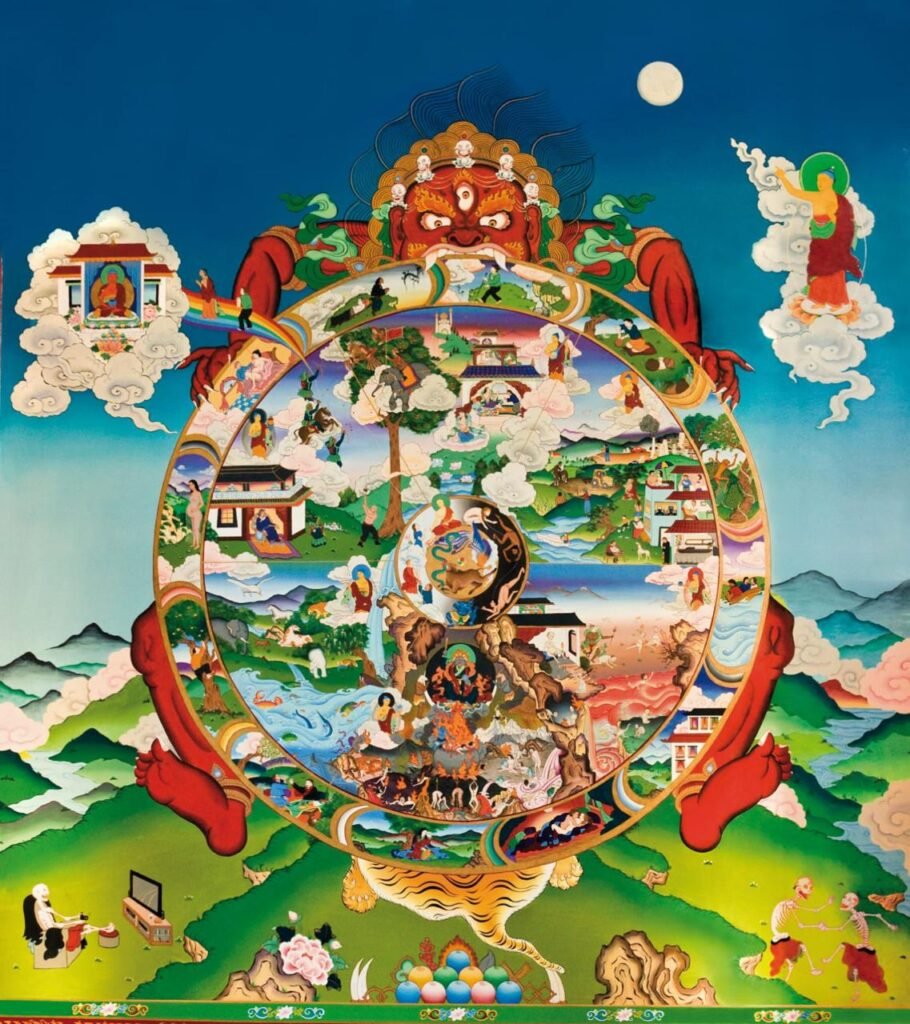 La Rueda de la Vida Un mapa de los seis estados por los que pasa una mente que retiene en lugar de ofrecer: los Dioses, los Semidioses, el Reino Humano, los Animales, los Seres Hambrientos y los Infiernos. En el centro, el jabalí, el gallo y la serpiente sostienen el ciclo desde adentro.